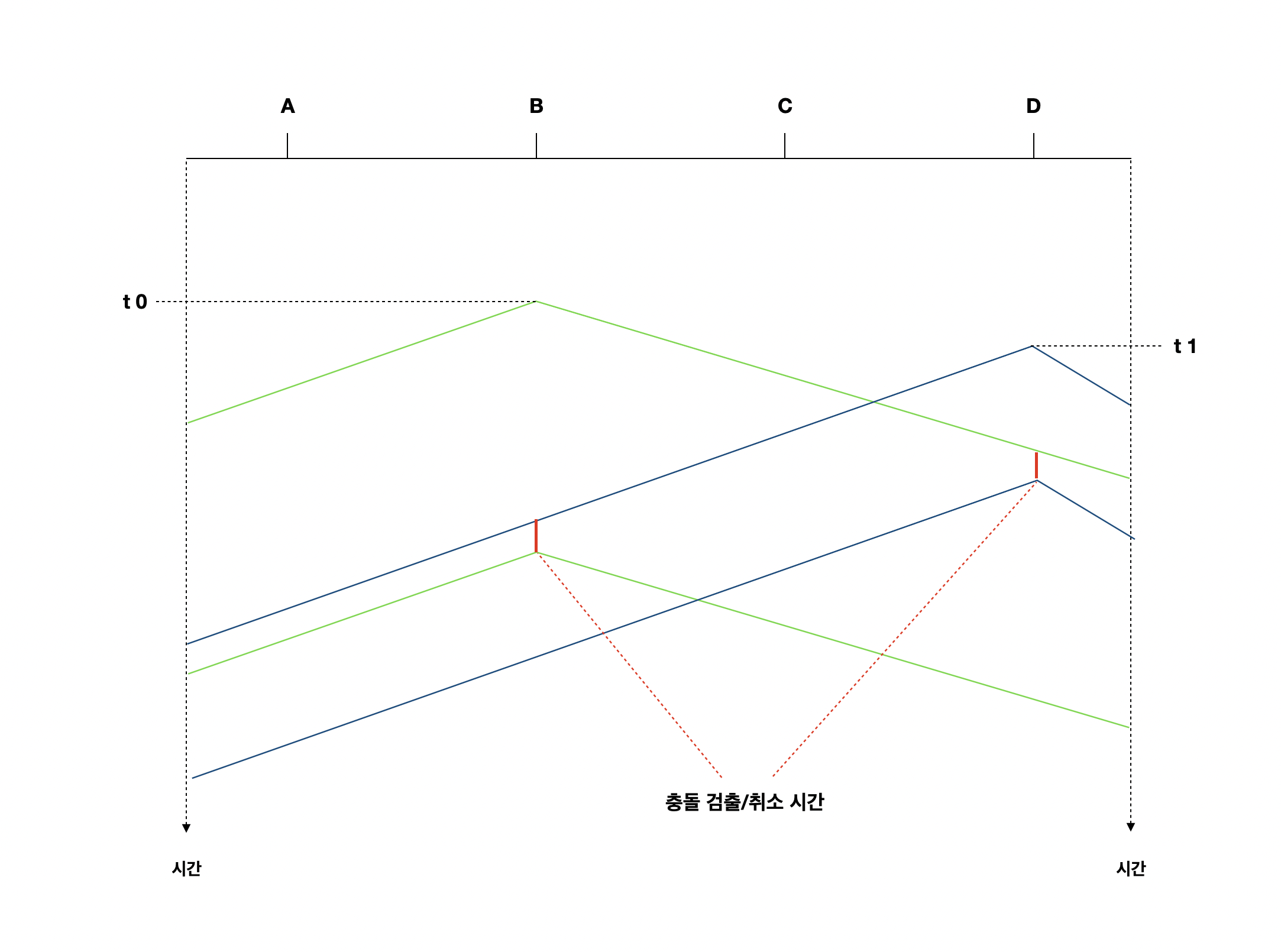 하지만, B와 D는 어느순간 충돌이 발생하게 됩니다. 그리고 이 두 노드는 충돌을 감지하면 서로 전송을 중단합니다. 여기서 취소하는 과정만 없으면 CSMA 프로토콜이 됩니다.