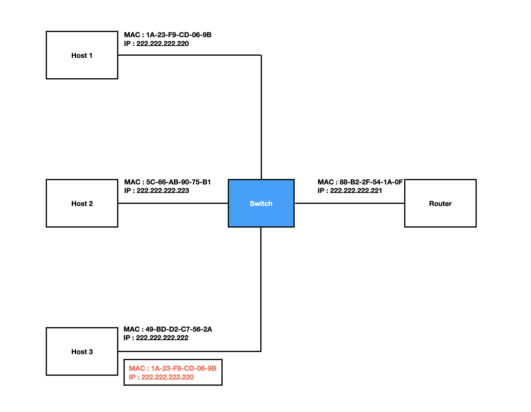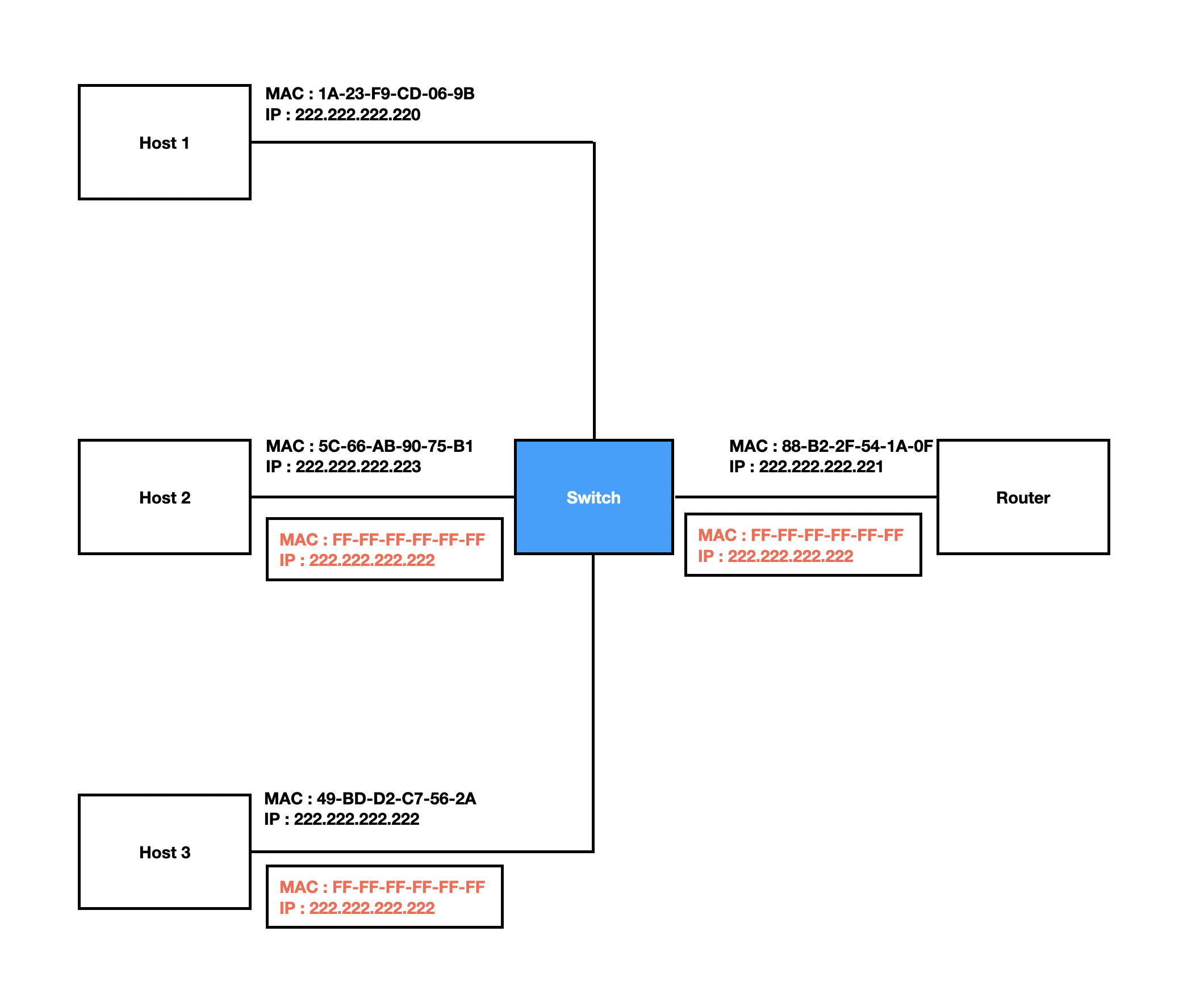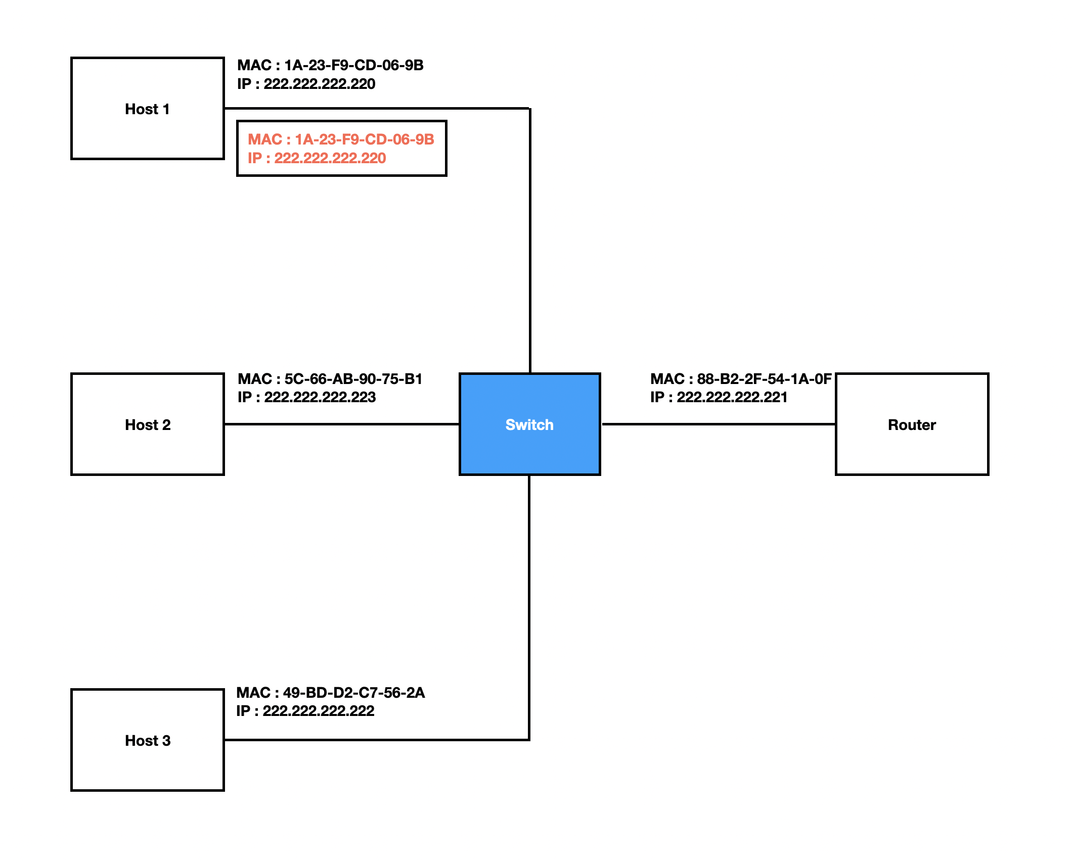 다시 이 그림으로 돌아와서 222.222.222.220이 송신 노드라고 가정하겠습니다. 현재 Host 1의 ARP 테이블에는 아무런 값도 매핑하고 있지 않다고 가정하겠습니다.