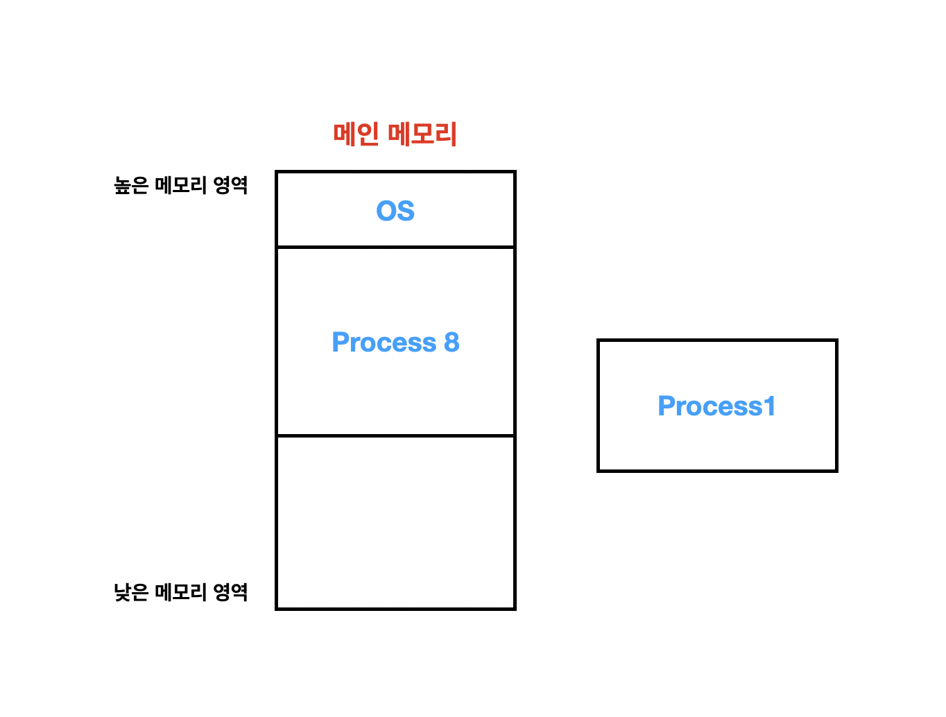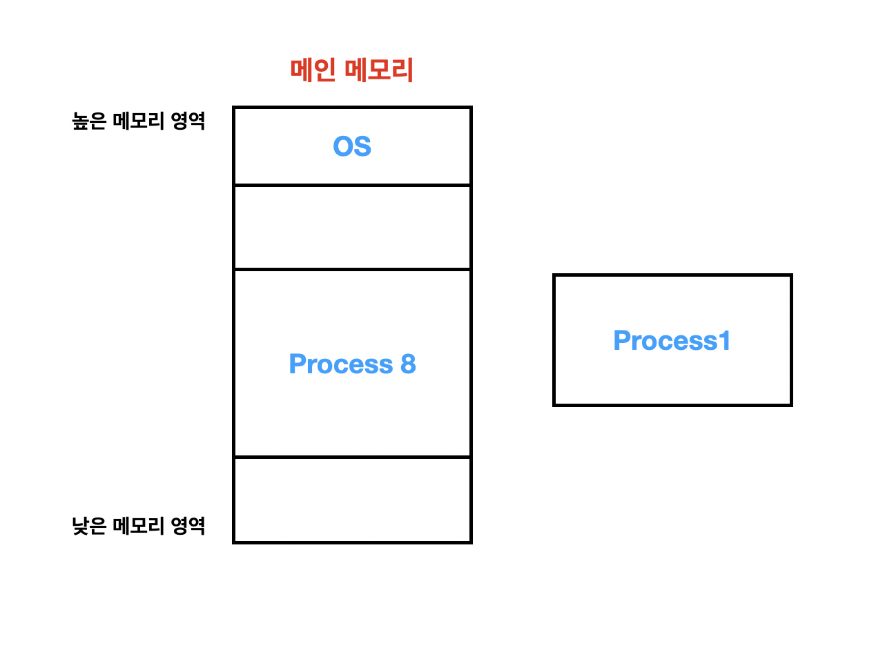 Process 1이 할당 받고자 하는 메모리 공간의 크기만큼 현재 메모리에는 여유가 없습니다. 그래서 Process 1은 메모리 영역에 올라갈 수가 없고 대기하게 됩니다.