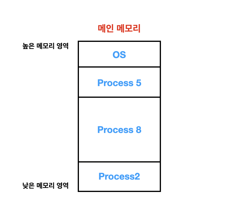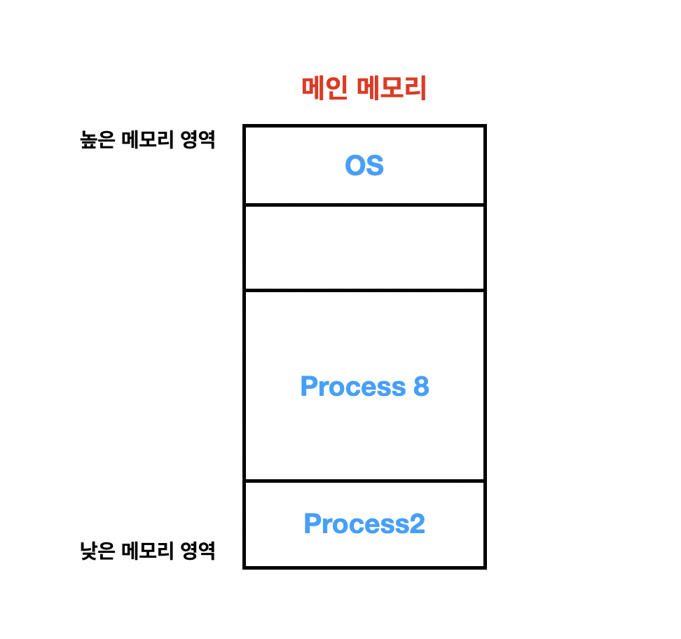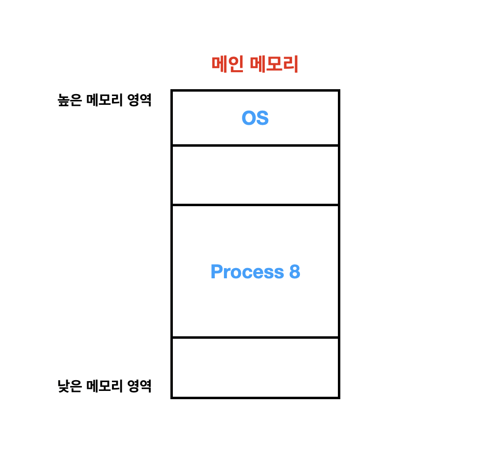 현재 메모리에 OS, Process 5, Process 8, Process 2가 올려져 있다고 보시면 됩니다. 아직까지는 큰 문제가 보이질 않습니다.