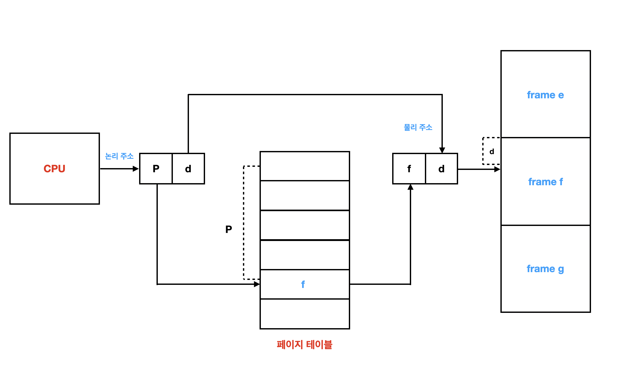 - CPU에서 나오는 모든 주소는 '페이지 번호(p)'와 '페이지 오프셋(d : page offset)' 부분으로 나누어졌습니다.