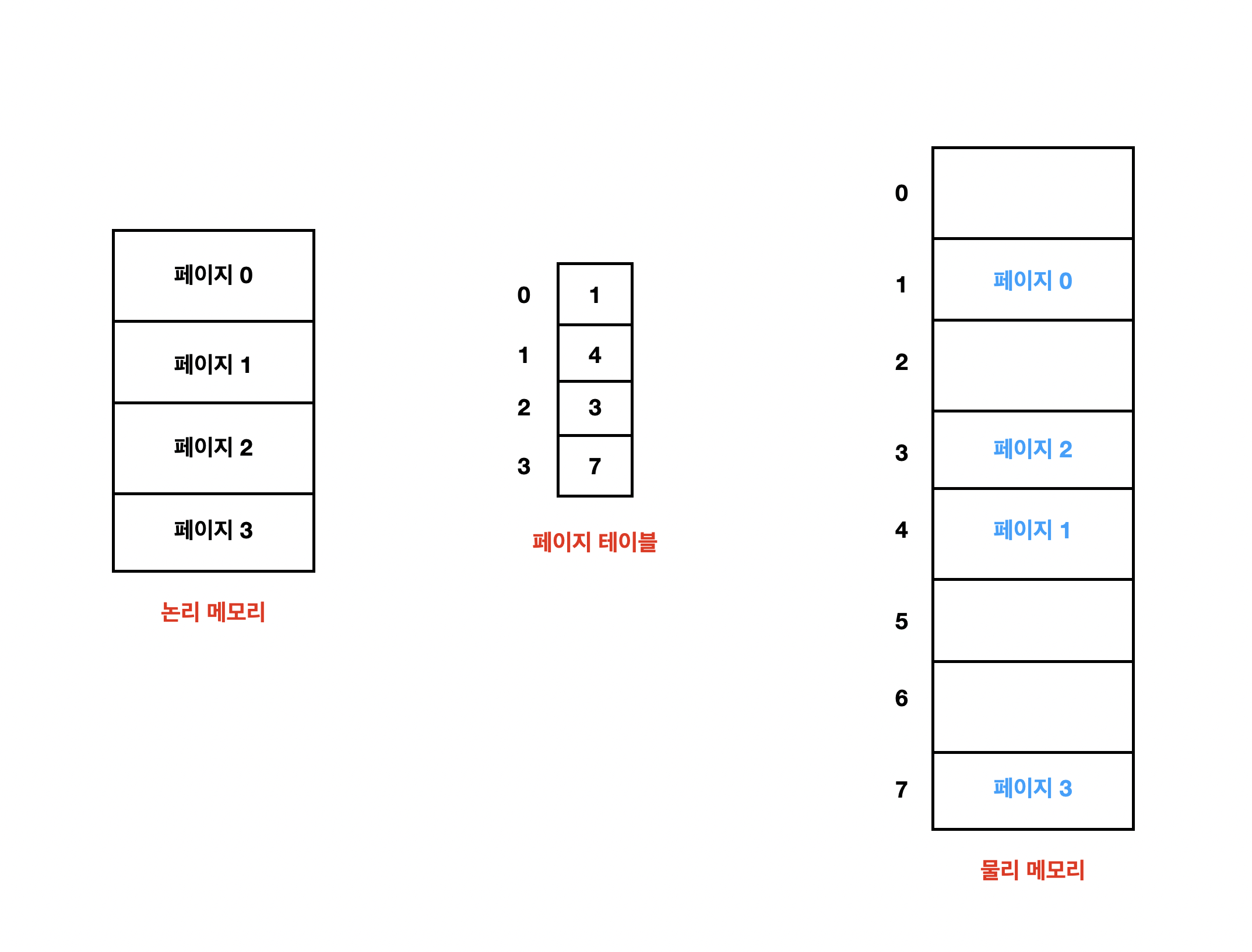 이렇게 페이징의 큰 아키텍처를 이해하게 되었는데요, 페이징을 적용했을때 논리 메모리와 물리 메모리의 관계는 어떻게 변할까요? 살펴봅시다.