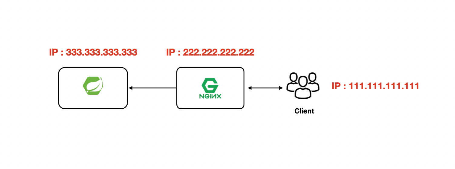 Client의 요청은 결국 Nginx를 거쳐 Spring WAS로 넘어옵니다. 이때 WAS 입장에서 HTTP 요청을 보낸 Client는 Nginx가 됩니다. 따라서 WAS에서 단순히 요청을 보낸 호스트의 IP 주소를 열어보면 Nginx의 IP 주소가 되는 것이죠. 실제 요청을 보낸 Client의 IP 주소를 모르는 것입니다.