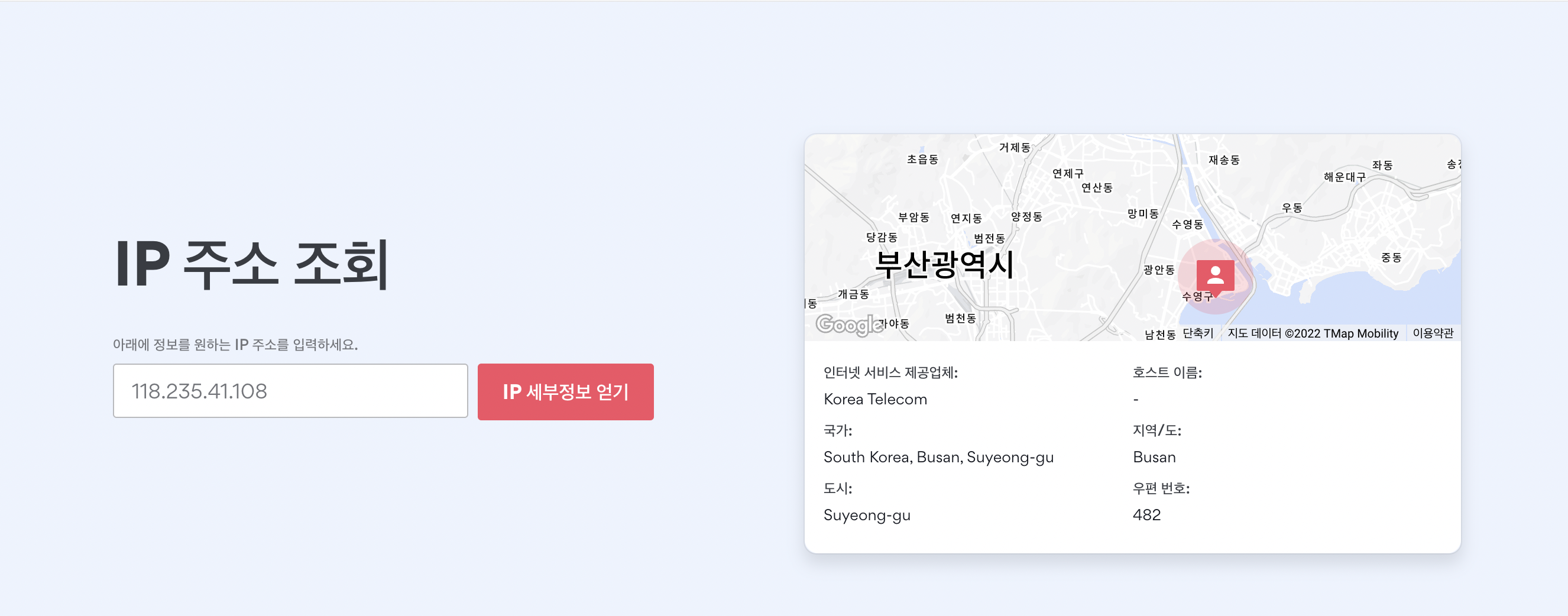 IP 주소를 얻었습니다. 서버는 제가 보낸 요청이 118.235.41.108 라는 주소로부터 왔다고 판단하는 것인데, 이 IP 주소는 어떤 장치가 할당받은 IP 주소일까요? IP 주소로 지리적 위치를 알려주는 서비스를 이용해봤습니다.
