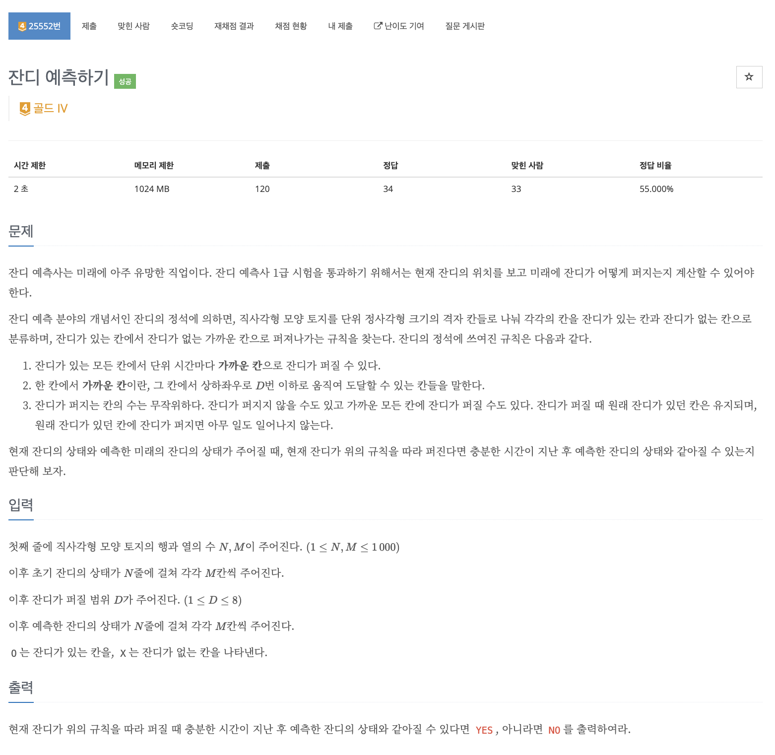 이제 이 방문값을 기준으로 BFS를 돌리면서 잔디만 찾아 영역을 확장하면 O(DNM)에 모든 방문을 확인할 수 있다. 모든 방문을 확인했다면, result 배열에서 O로 표시된 좌표를 방문한적 있는지 없는지 확인하고, 모든 O에 대하여 방문할 수 있다면 YES를 아니라면 NO를 출력하면 된다.