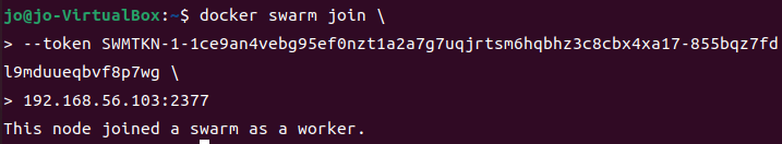 출력 결과를 보면, docker swarm join을 볼 수 있는데, 이 명령어는 새로운 워커 노드를 스웜 클러스터에 추가할 때 사용된다. --token 옵션에 사용된 토큰 값은 새로운 노드를 해당 스웜 클러스터에 추가하기 위한 비밀키이다.
