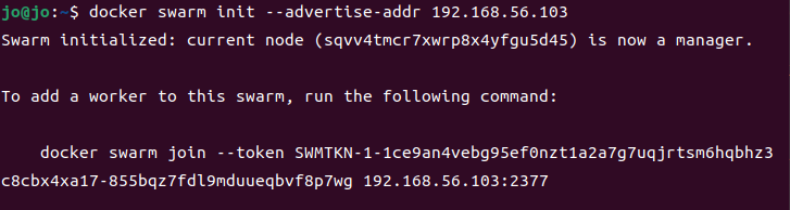 --advertise-addr에는 다른 도커 서버가 매니저 노드에 접근하기 위한 IP 주소를 입력하면 된다.