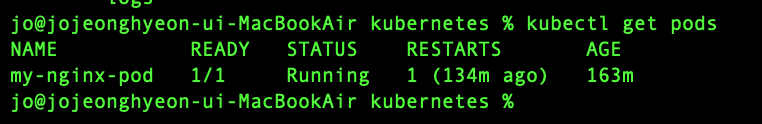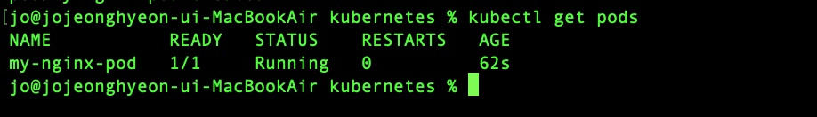 kubectl get <오브젝트 이름>을 사용하면 특정 오브젝트의 목록을 확인할 수 있다. 그리고 kubectl get pods 명령어는 현재 쿠버네티스에 존재하는 파드의 목록을 출력한다.