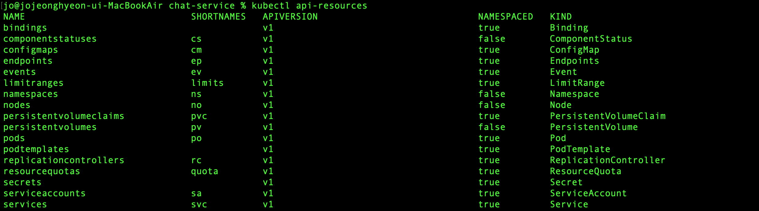 그러면, 쿠버네티스에서 사용할 수 있는 오브젝트에는 어떤 것이 있는지 kubectl-api-resources 명령어를 사용해 확인해 보도록 하자.