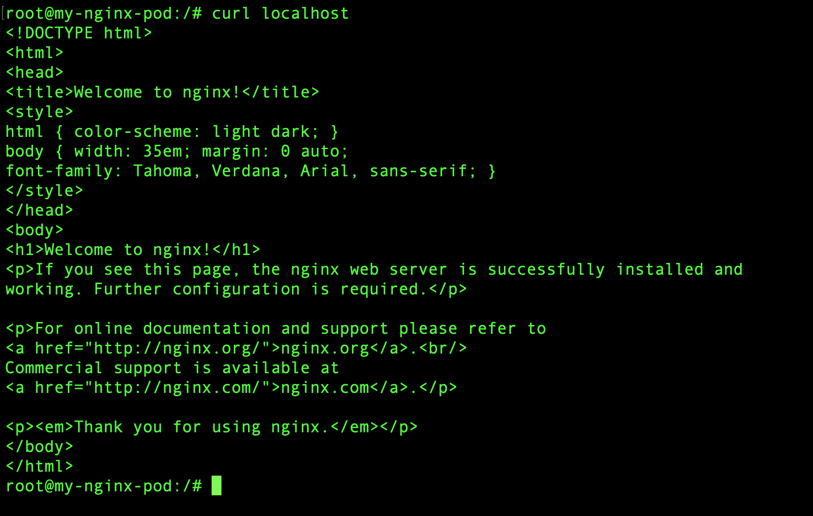 그리고 ubuntu-sidecar-container 컨테이너 내부에서 로컬호스트로 HTTP 요청을 전송하면 Nginx 서버의 응답이 도착하는 것을 확인할 수 있다.