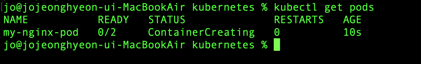 앞서 파드를 생성했던 것처럼 kubectl apply -f 명령을 사용해 YAML 파일을 쿠버네티스에 적용하자. 그리고 시간이 조금 지나면, Nginx 파드에 2개의 컨테이너가 실행 중인 것을 확인할 수 있다.