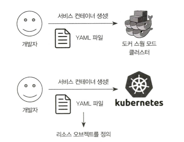 스웜 모드에서 스택(stack)을 생성하기 위해 YAML 파일을 사용했던 것처럼 쿠버네티스도 YAML 파일로 컨테이너 리소스를 생성하거나 삭제할 수 있다. 그러나 쿠버네티스에서 YAML 파일의 용도는 컨테이너뿐만 아니라 거의 모든 리소스 오브젝트들에 사용될 수 있다는 것이 가장 큰 특징이다. 예를 들어 컨테이너 자체는 물론이고, 컨테이너의 설정값, 비밀값 등도 모두 YAML 파일로 정의해 사용한다. 그리고 쿠버네티스에서 실제로 서비스를 배포할 때에도 kubectl 명령어가 아닌 여러 개의 YAML 파일을 정의해 쿠버네티스에 적용시키는 방식을 사용한다.