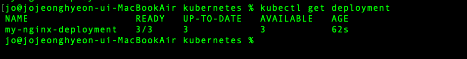 생성된 디플로이먼트의 목록은 파드나 레플리카셋에서 목록을 출력했던 것과 동일하게 kubectl get deployment 명령어로 출력할 수 있다.