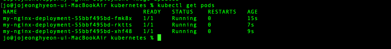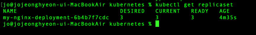 my-nginx-deployment라는 이름의 디플로이먼트가 생성돼 있으며, READY 항목의 3/3이라는 출력을 통해 3개의 파드가 정상적으로 준비됐음을 알 수 있다. 그러나 이전에 설명했던 것처럼 일정 개수의 파드가 유지되도록 생성하는 것은 레플리카셋이기 때문에 실제로는 디플로이먼트와 함께 레플리카셋 또한 생성되어 있을 것이다.