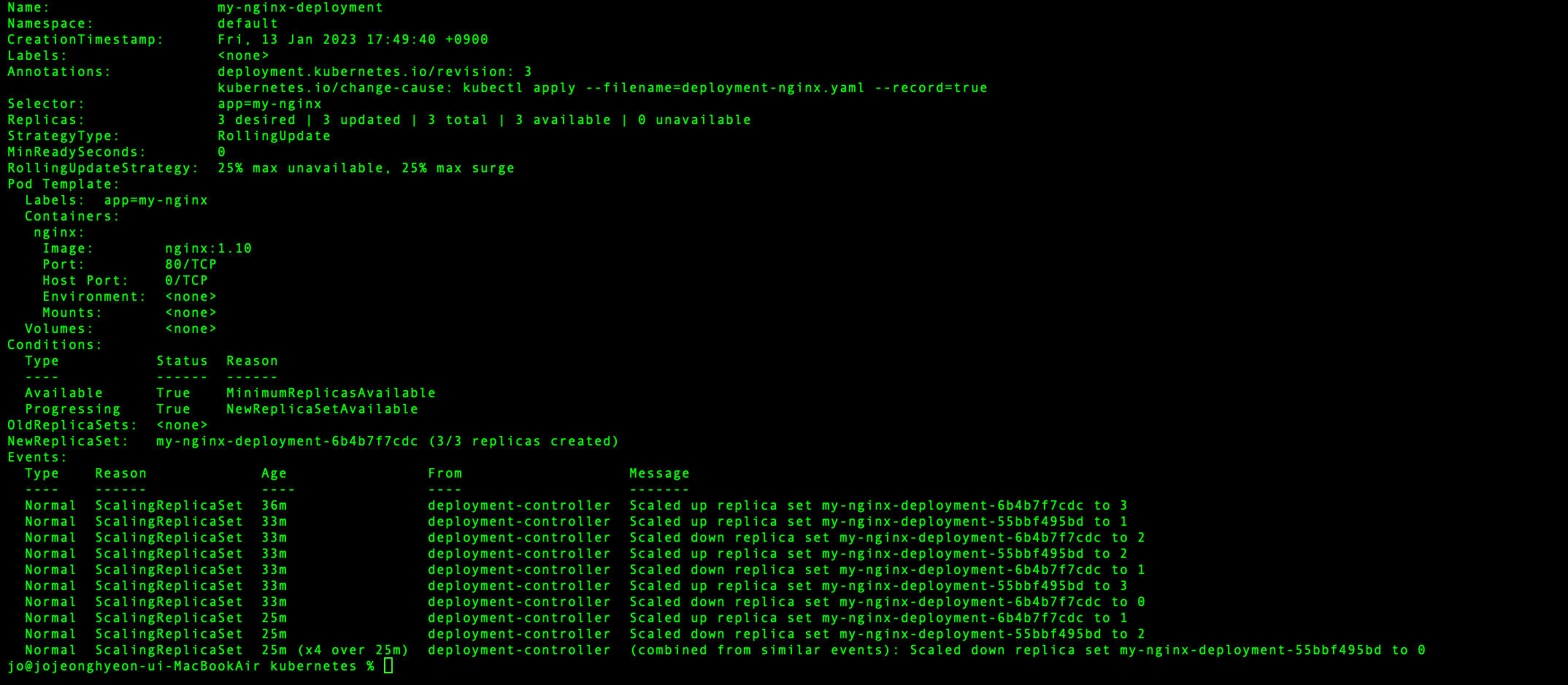 쿠버네티스 리소스의 자세한 정보를 출력하는 kubectl describe 명령어를 사용해 디플로이먼트의 정보를 출력해 보면, 현재의 레플리카셋 리비전 정보와 활성화된 레플리카셋 이름을 확인할 수 있다.