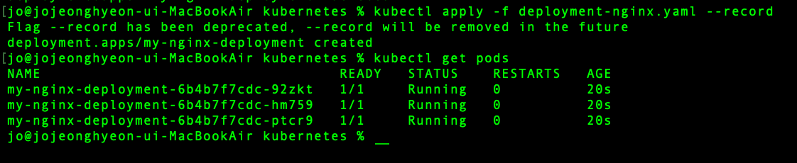 좀 더 쉬운 이해를 위해 디플로이먼트를 이용해 애플리케이션의 버전을 업데이트해 배포하는 간단한 예시를 살펴보자. 이전과 동일한 YAML 파일로 디플로이먼트를 생성하되, 이번에는 --record라고 하는 조금 특수한 옵션을 추가한다.