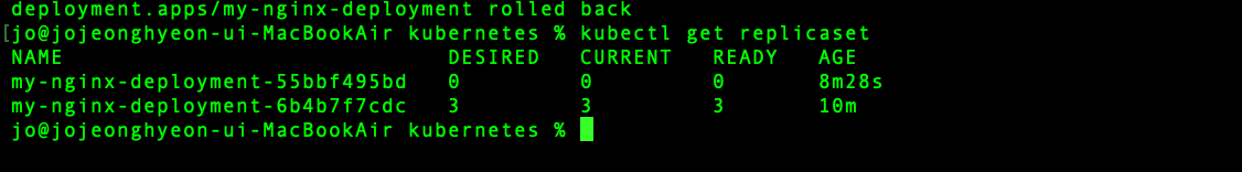 다시 레플리카셋의 목록을 확인해보면 처음에 생성했던 레플리카셋이 다시 3개의 파드를 생성하고 있는 것을 알 수 있다. 물론 방금 새롭게 생성됐던 레플리카셋의 파드는 0으로 줄어들었다.
