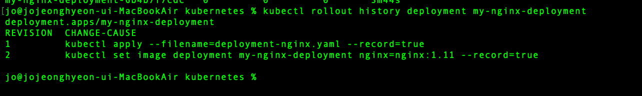 --record=true 옵션으로 디플로이먼트를 변경하면 변경 사항을 위와 같이 디플로이먼트에 기록함으로써 해당 버전의 레플리카셋을 보존한다. 만약 이전 버전의 레플리카셋으로 되돌리는 롤백을 하고 싶다면 다음의 명령어를 사용하면 된다. --to-revision에는 되돌리려는 리비전의 번호를 입력하면 된다.