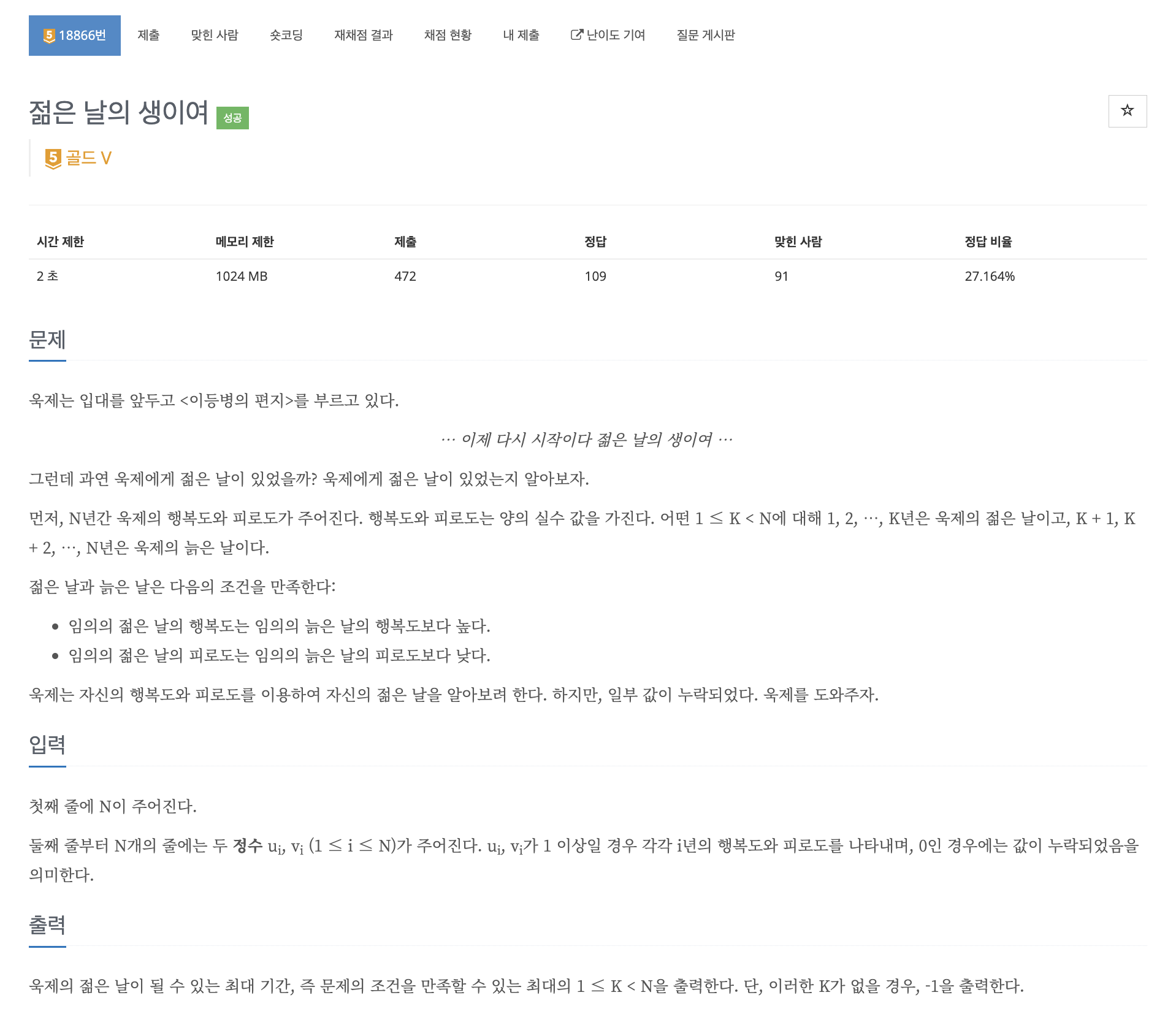 N개의 u, v가 주어진다. 구하고 싶은 값은 K인데 i < K, K < j라고 할때 ui > uj, vi < vj를 만족하는 K를 구해야 한다.