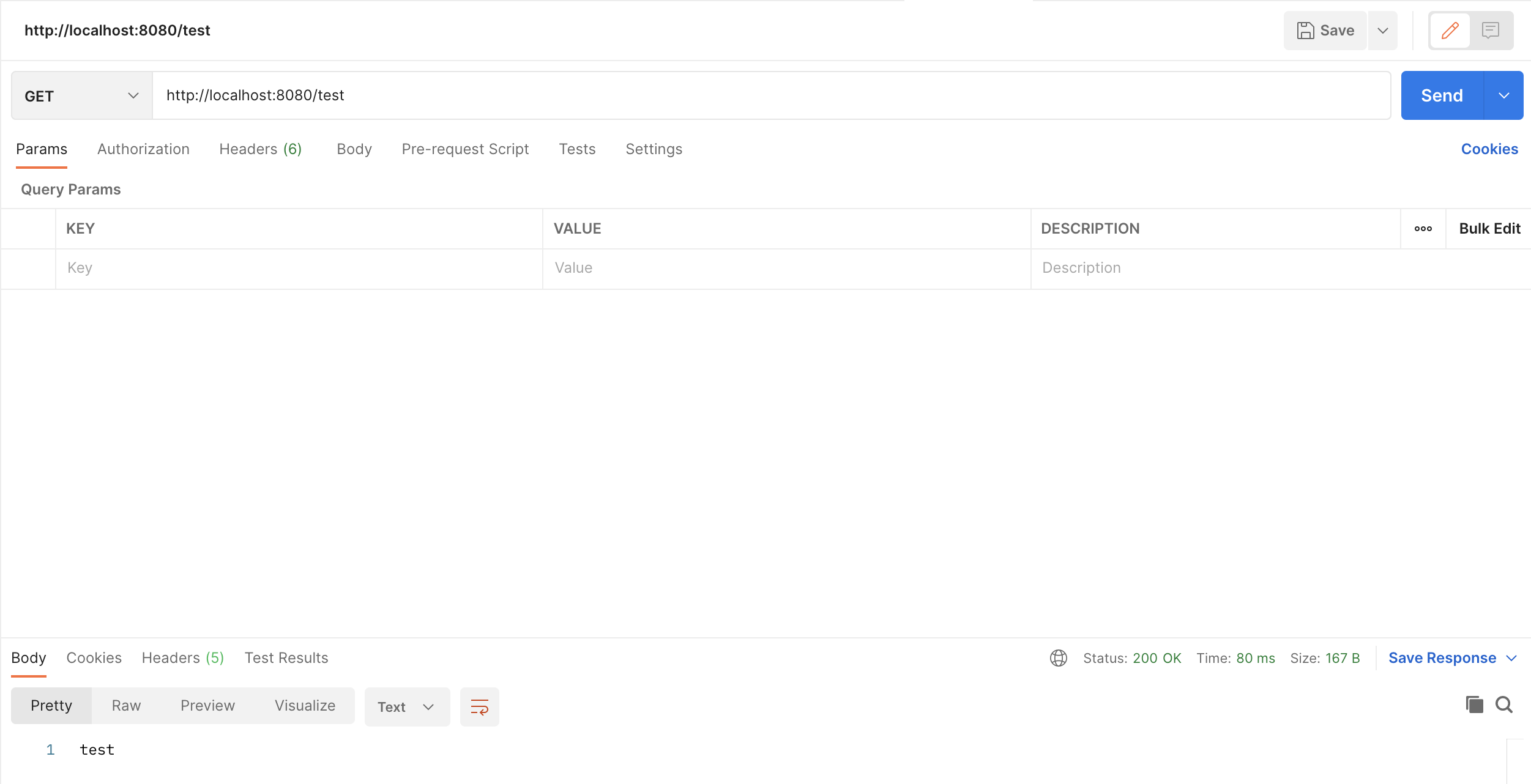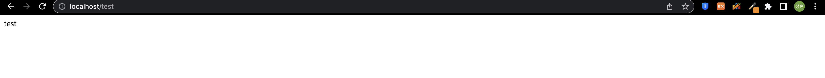 정상적으로 container가 실행된 것을 볼 수 있다. 그리고 실제로 http://localhost:8080/test에 접속해보면 아래와 같은 응답을 얻을 수 있다.