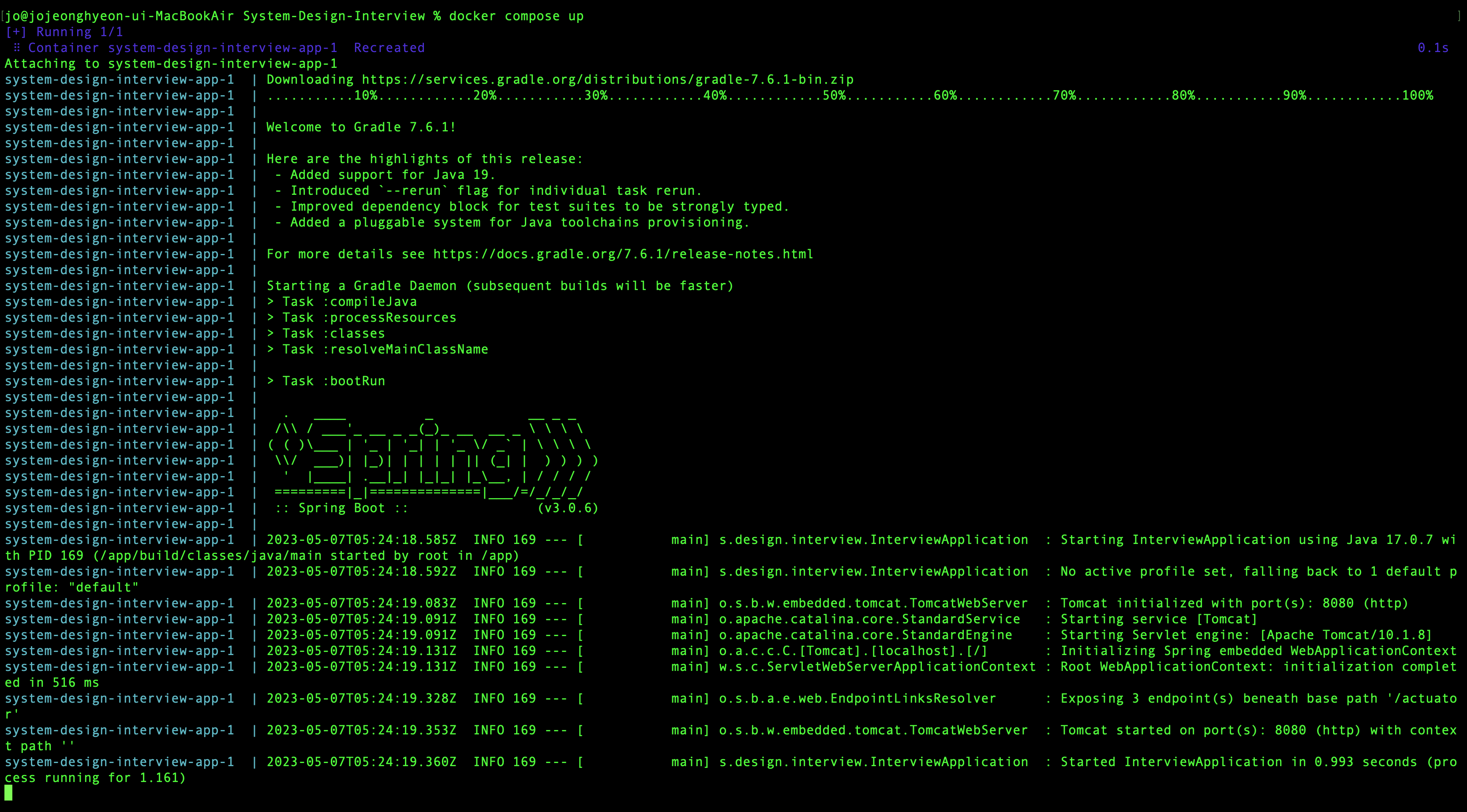 docker compose 파일을 모두 작성했다면, 아래의 명령어를 통해 spring app container를 실행시켜보자.