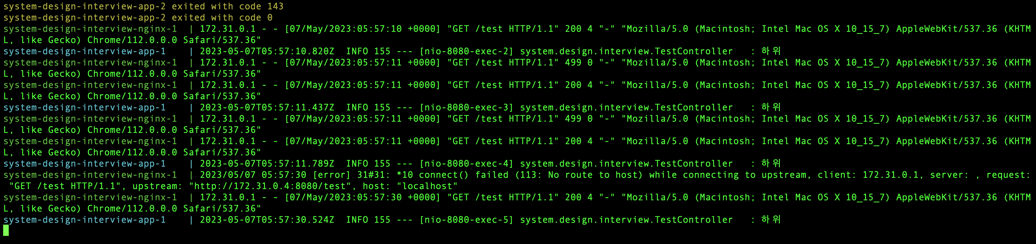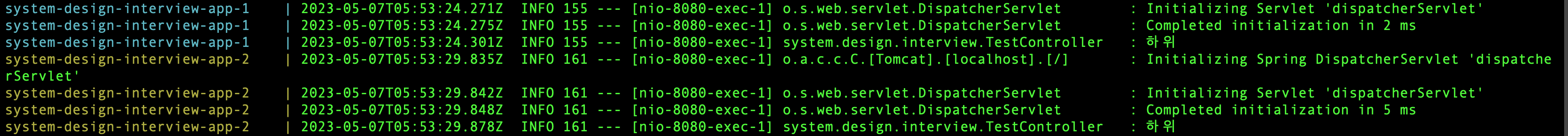 터미널에 찍힌 로그를 보면, app-1에 '하위'가 1번, app-2에 '하위'가 1번 찍힌 것을 볼 수 있다. 분명 같은 요청을 보냈지만 서로 다른 컨테이너로 요청이 분산되어 전달된 것이다.