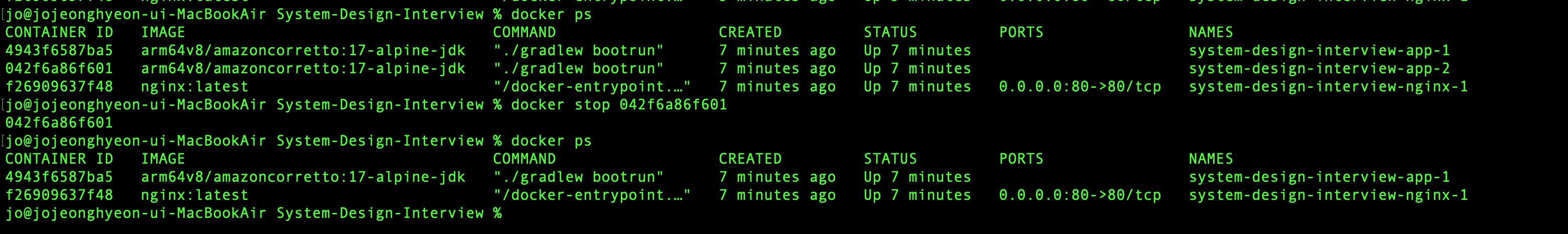 요청을 여러번 보내봤지만, 이전과 똑같은 응답을 받기 때문에 app-2 container가 종료되었는지 조차 알지 못한다.