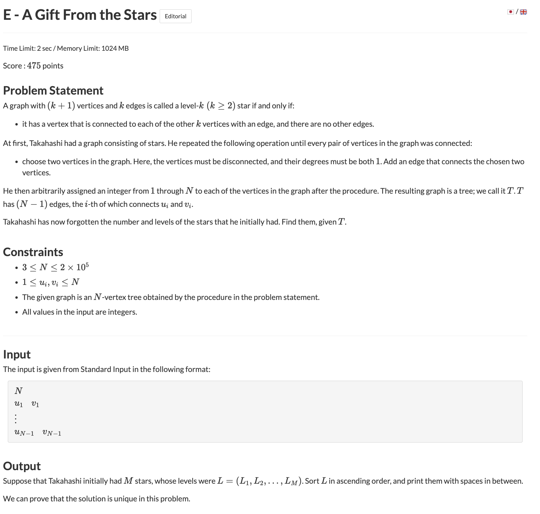 트리가 주어지고, 여기서 star를 찾고자 하는 문제이다. 각 노드는 단 하나의 star에만 속할 수 있고, K - star는 star node와 연결된 노드의 개수로 결정이 된다. 그리고 Tree 형태로 주어지기 때문에 모든 노드는 star에 속할 수 밖에 없다.