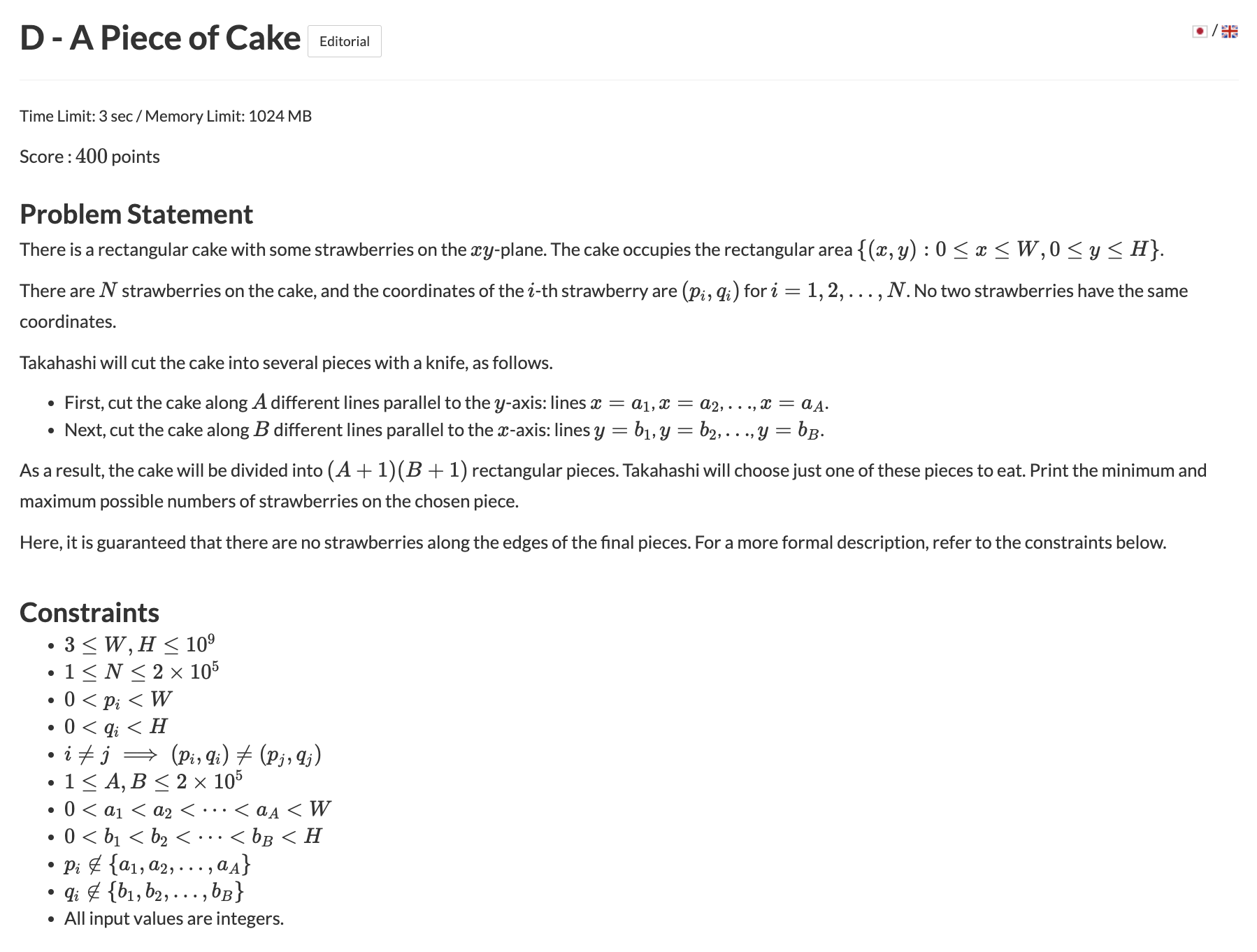 딸기의 위치가 2차원 격자로 주어지고, 이 2차원 격자를 A개의 row, B개의 column으로 자르려고 한다. 그러면 (A+1) * (B+1)개의 공간이 생기게 되는데, 여기서 발생한 공간 중 딸기가 존재하는 최소 영역과 최대 영역을 구하면 되는 문제이다.