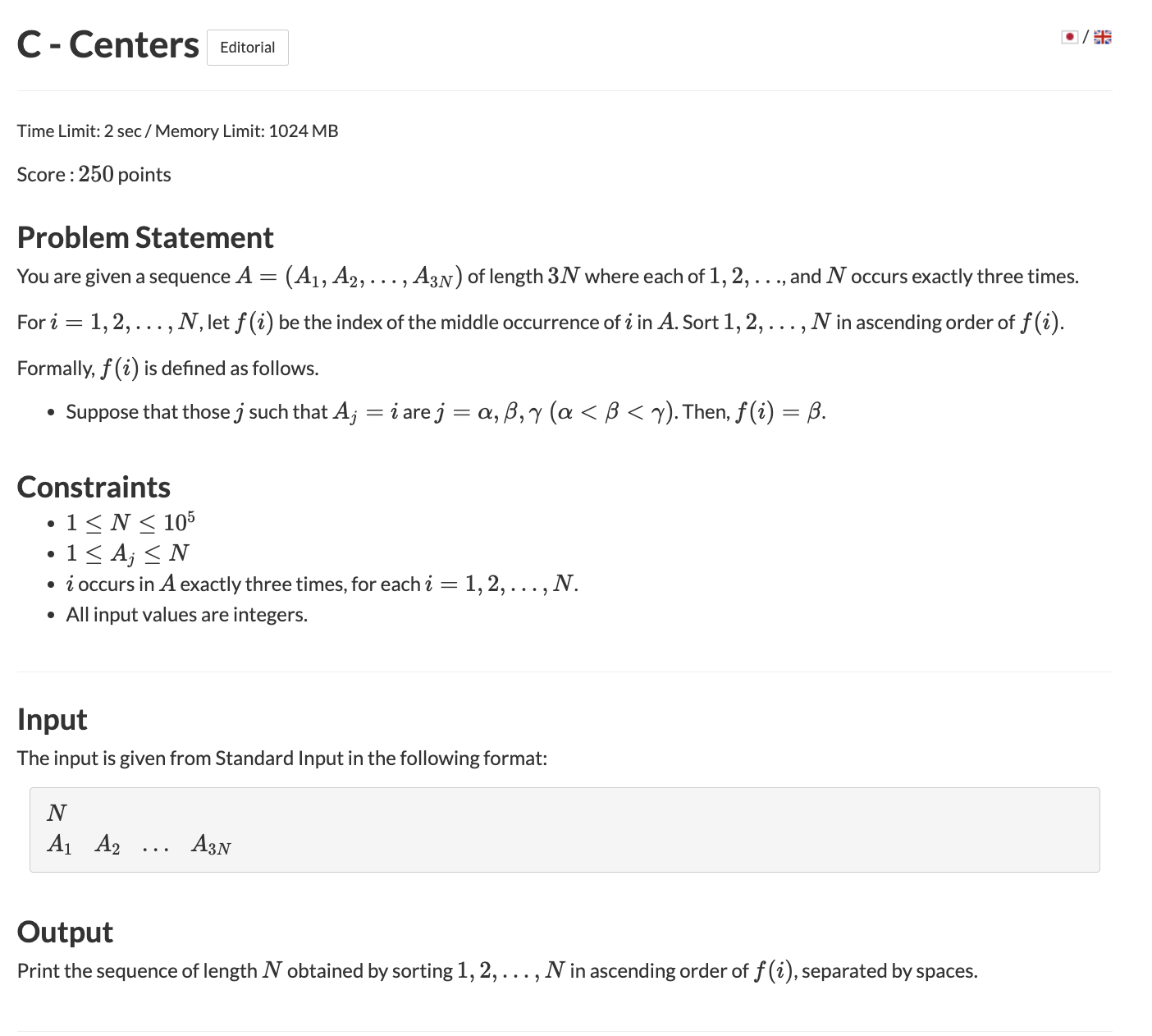 N이 주어지고 3 * N개의 입력으로 숫자들이 입력된다. 이때 i (1 <= i <= N)에 속하는 숫자들은 반드시 3번 입력이 된다.